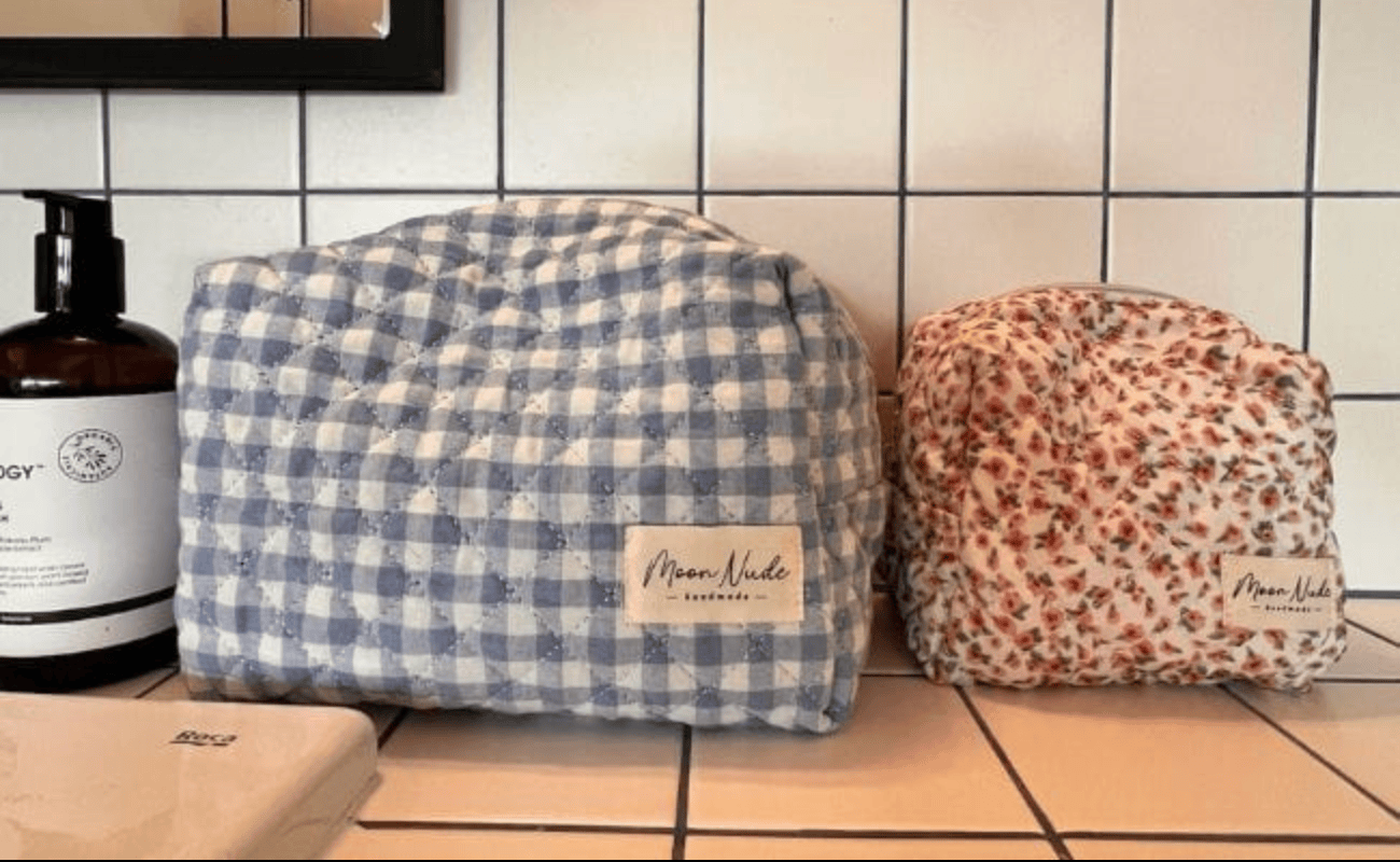 The quilted exterior is made from a beautiful blue gingham material, complemented by a matching gingham interior.